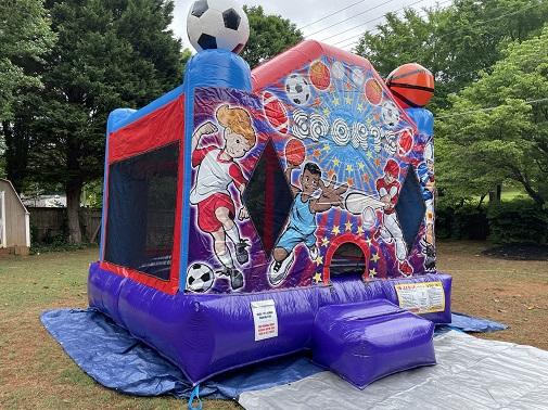 • This bounce house is perfect for your athlete.  Features a soccer, basketball, baseball or football player.